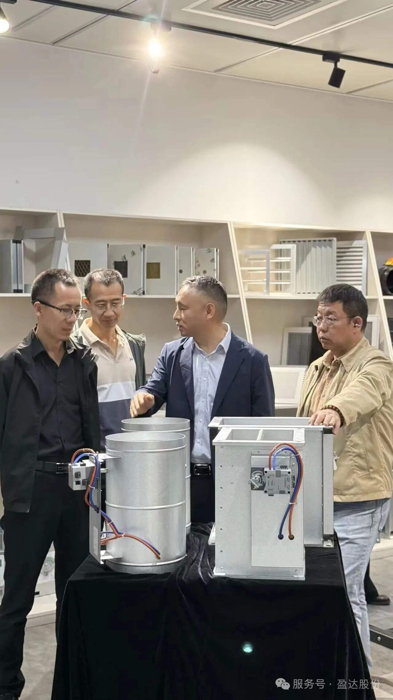 参观环节中,江苏分厂厂长郭昭明携技术团队陪同各领导参观样品展示中心,重点展示了风口、风阀等核心产品的创新设计与应用性能,现场交流气氛热烈。